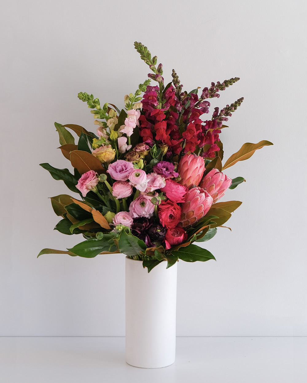 She’s bright, bold and a little bit naughty, the life of the party, she’ll get your attention!. This gorgeous bouquet is filled with rich berry and orange blooms, with a hint of tropical, making it the perfect gift to brighten someone’s day